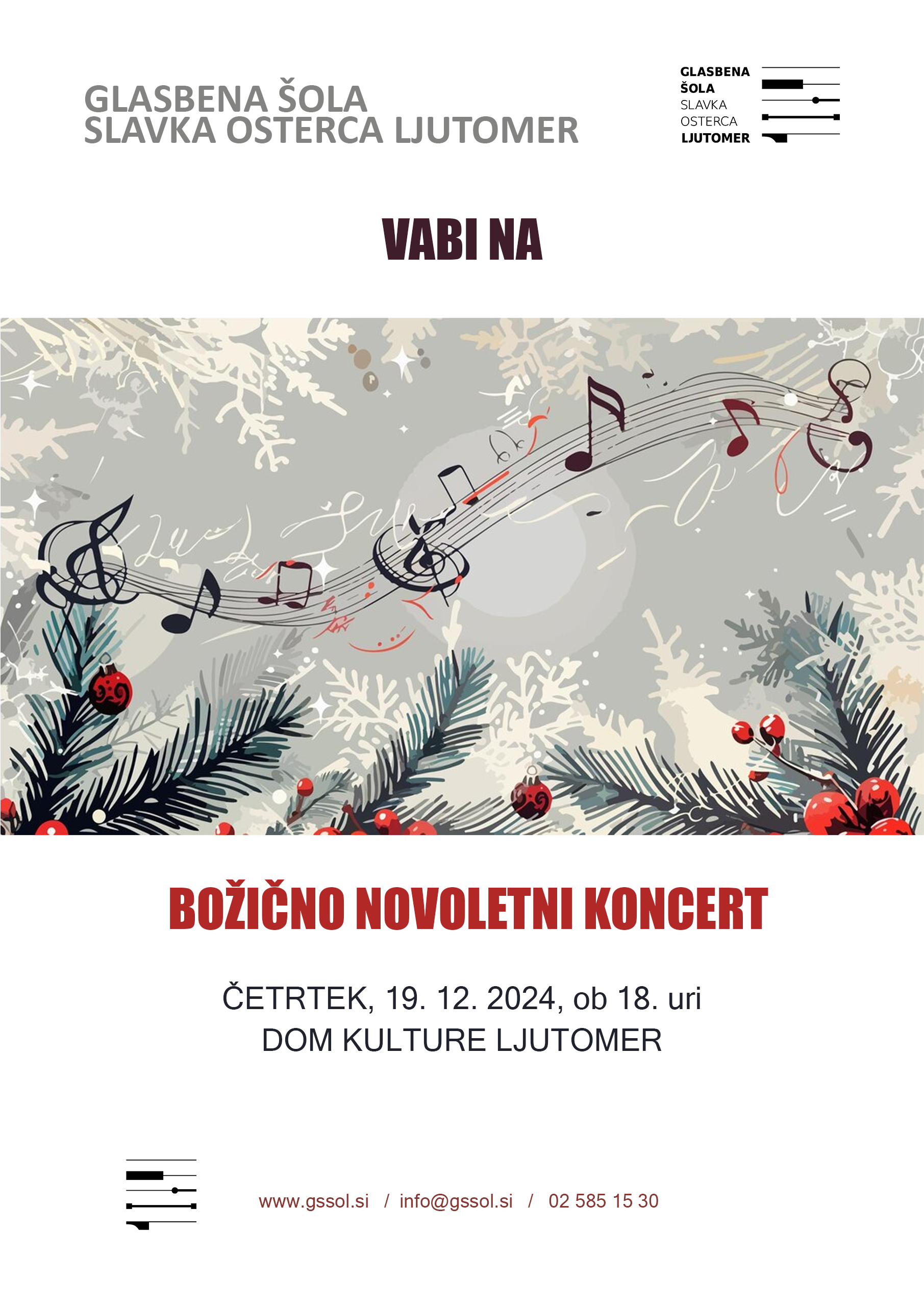 Vabljeni, da se udeležite Božično-novoletnega koncerta Glasbene šole Slavka Osterca Ljutomer, ki bo v četrtek, 19. 12. 2024 ob 18. uri v Domu kulture Ljutomer.