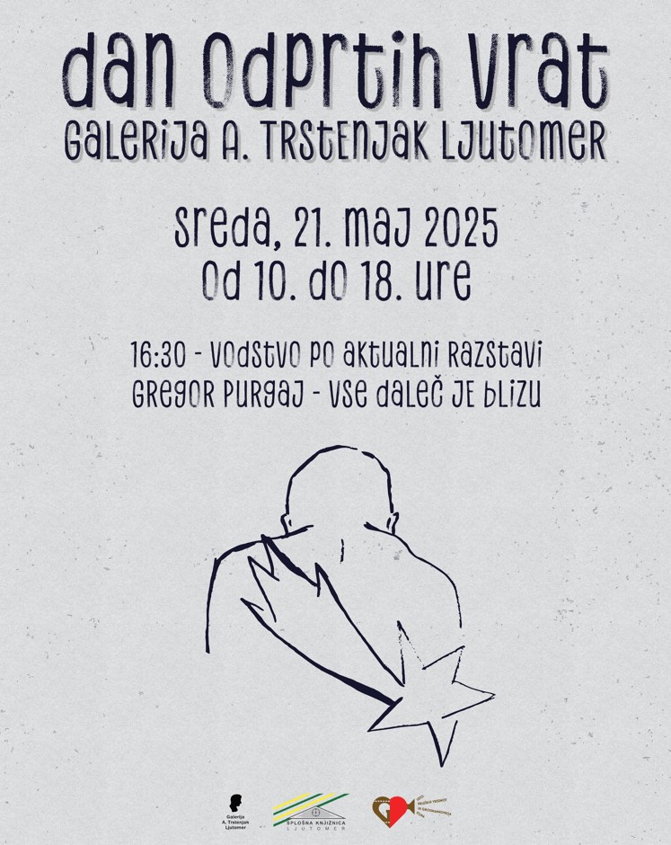 Vabljeni na DAN ODPRTIH VRAT Galerije A. Trstenjak Ljutomer. Pridružite se nam v sredo, 21. maja 2025, od 10. do 18. ure, in si oglejte razstavo "vse daleč je blizu" - Gregor Purgaj. Ob 16.30 uri se nam bo pridružil avtor razstave, ki bo pripravil strokovno vodstvo in nas popeljal skozi razstavljena dela.