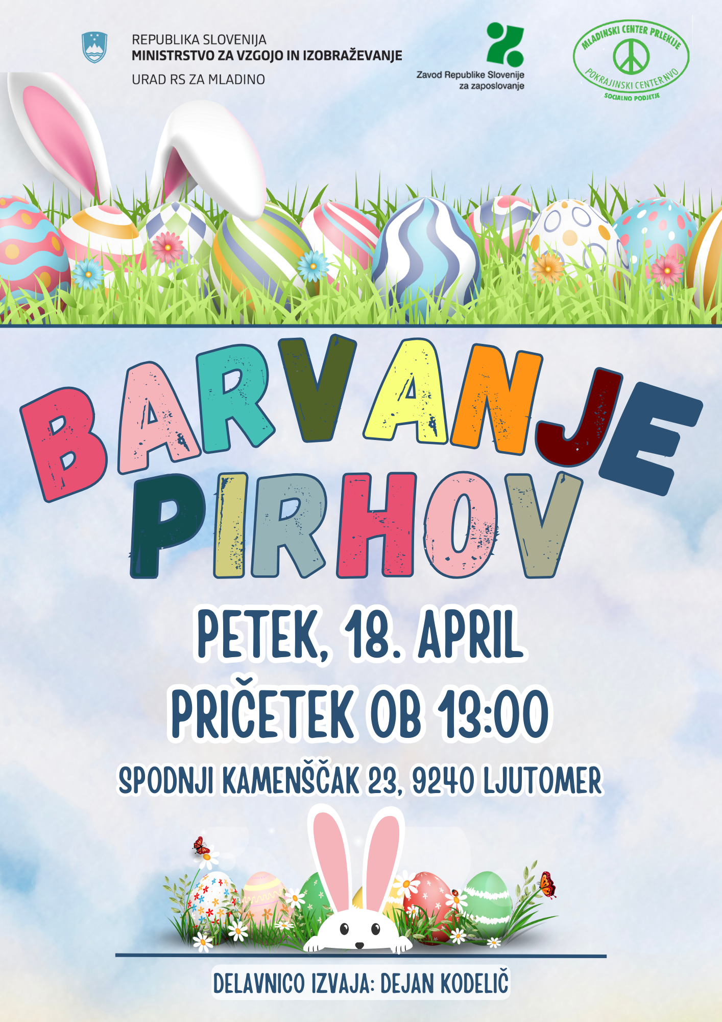 Vljudno vabljeni na delavnico barvanja pirhov, ki bo potekala v petek, 14. aprila, ob 13. uri v Mladinskem centru Prlekije na Spodnjem Kamenščaku 23.