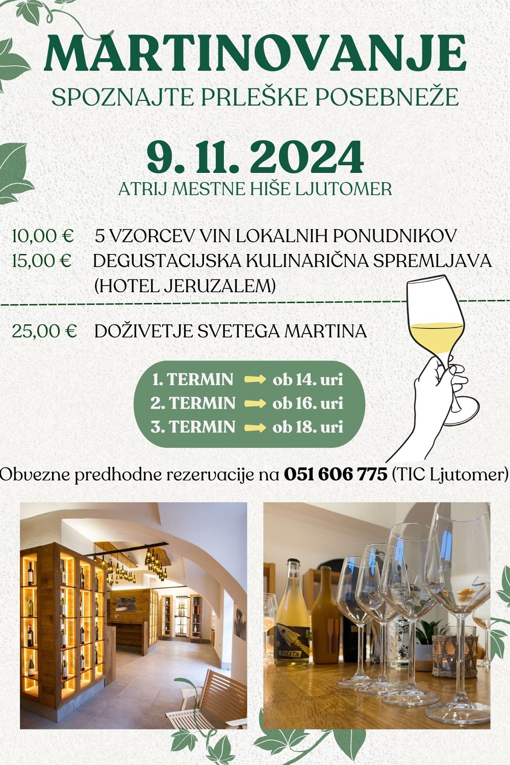 Privoščite si nepozabno “Doživetje svetega Martina”, kjer vas čaka 5 izvrstnih vzorcev vin lokalnih ponudnikov za 10 € ter okusna degustacijska kulinarična spremljava za 15 €. Vse to za samo 25 € – popolna priložnost za uživanje v bogatih okusih in domači tradiciji!