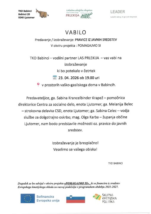 TKD Babinci v okviru projekta Pomagajmo si (LAS Prlekija) vabi na izobraževanje na temo Pravice do javnih sredstev.