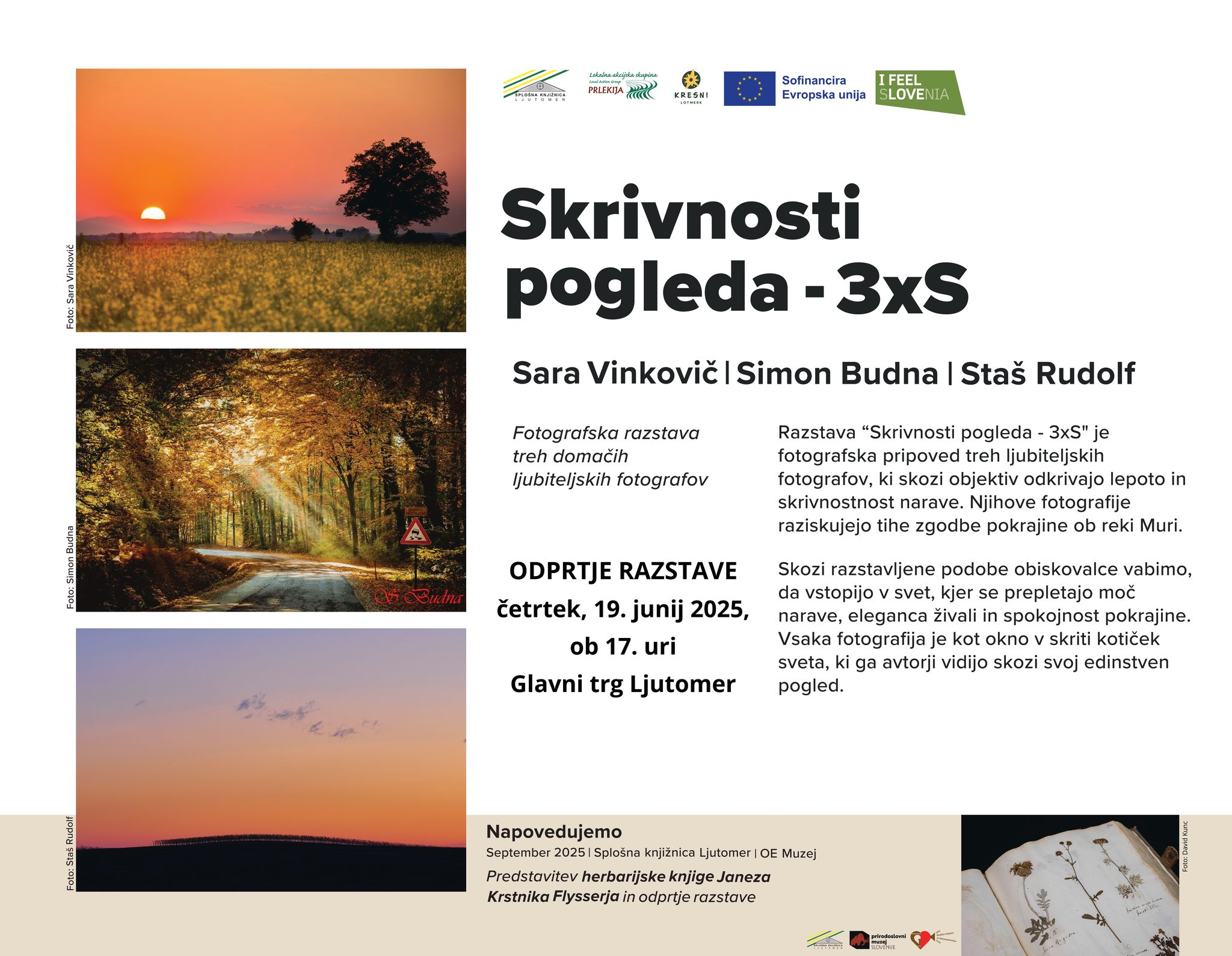 Razstava “Skrivnosti pogleda - 3xS” je fotografska pripoved treh ljubiteljskih fotografov, ki skozi objektiv odkrivajo lepoto in skrivnostnost narave. Njihove fotografije raziskujejo tihe zgodbe pokrajine ob reki Muri.
