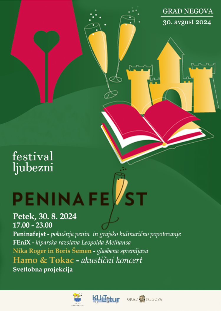 Vabljeni na penina fest, ki bo v petek 30.8.2024, od 17.00-23.00, na gradu Negova. Na dogodku bo pokušnja penin, grajsko kulinarično potovanje, kiparska razstava Leopolda Methansa, ob glasbeni spremljavi Nike Roger ter Borisa Šemna. Večer bodo popestrili z akustičnim koncertom - Hamo & Tokac.