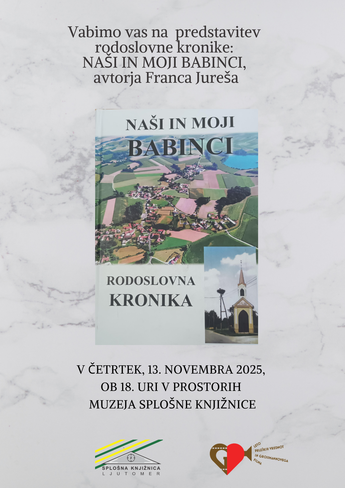 Vabimo vas na predstavitev rodoslovne kronike: Naši in moji Babinci , avtorja Franca Jureša, v četrtek, 13. novembra 2025 ob 18. uri v prostorih muzeja Splošne knjižnice Ljutomer.