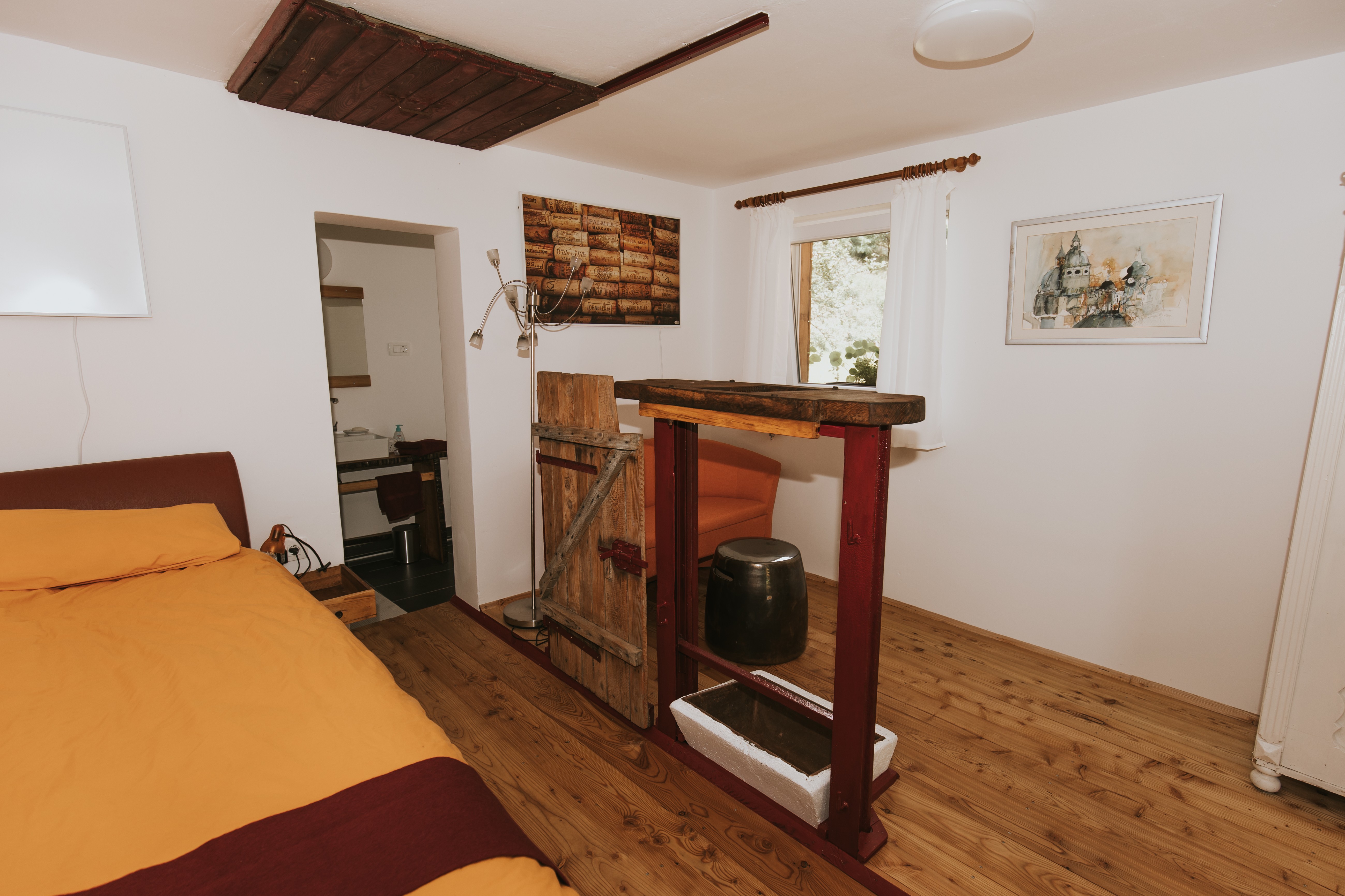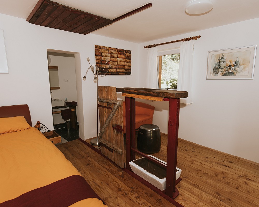 Our Rooms are inspired by nature and we want to share it with people who are looking for the beauty. Whether alone, or with friends or family, for hiking, biking, retreat or a team workshop – there is the possibility of tasting wines in the Lodge. Try our own experimental wine “Troubadour”, organically grown and pesticide-free. We think wine and art go well together and suspect you will too! The Lodge is an old wine’s homestead, lovingly renovated and furnished with an eye to design. Each of the four rooms plus the Winegrower’s House is unique and full of magic and beauty, telling stories with beautiful works of art from around the world. Experience the life among the vines and trees, wood sculptures and land art. Perhaps you’ll add to the collection. Welcome!