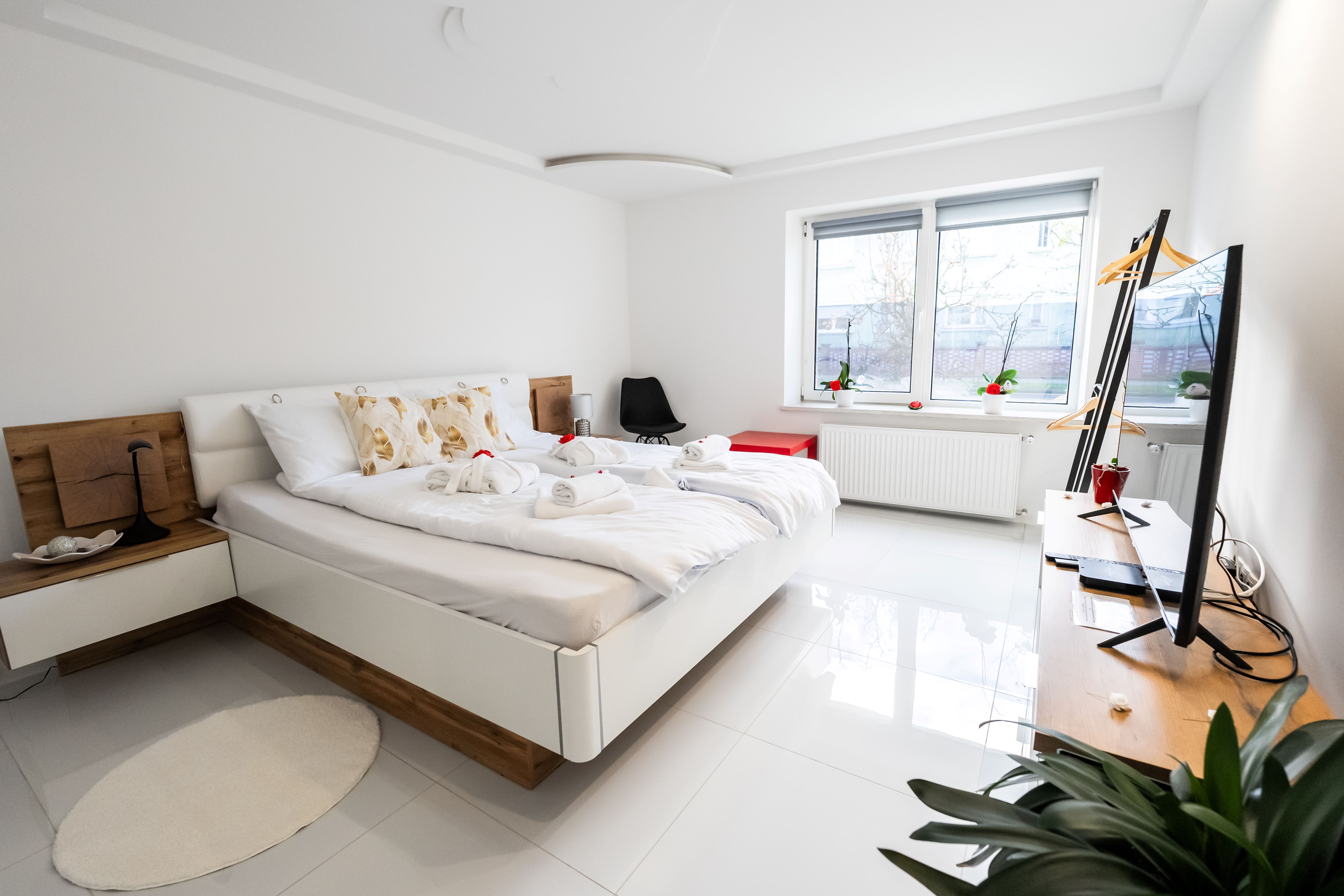 Zakonsko posteljo s posteljnino, osnovnimi brisačami in kopalnimi plašči