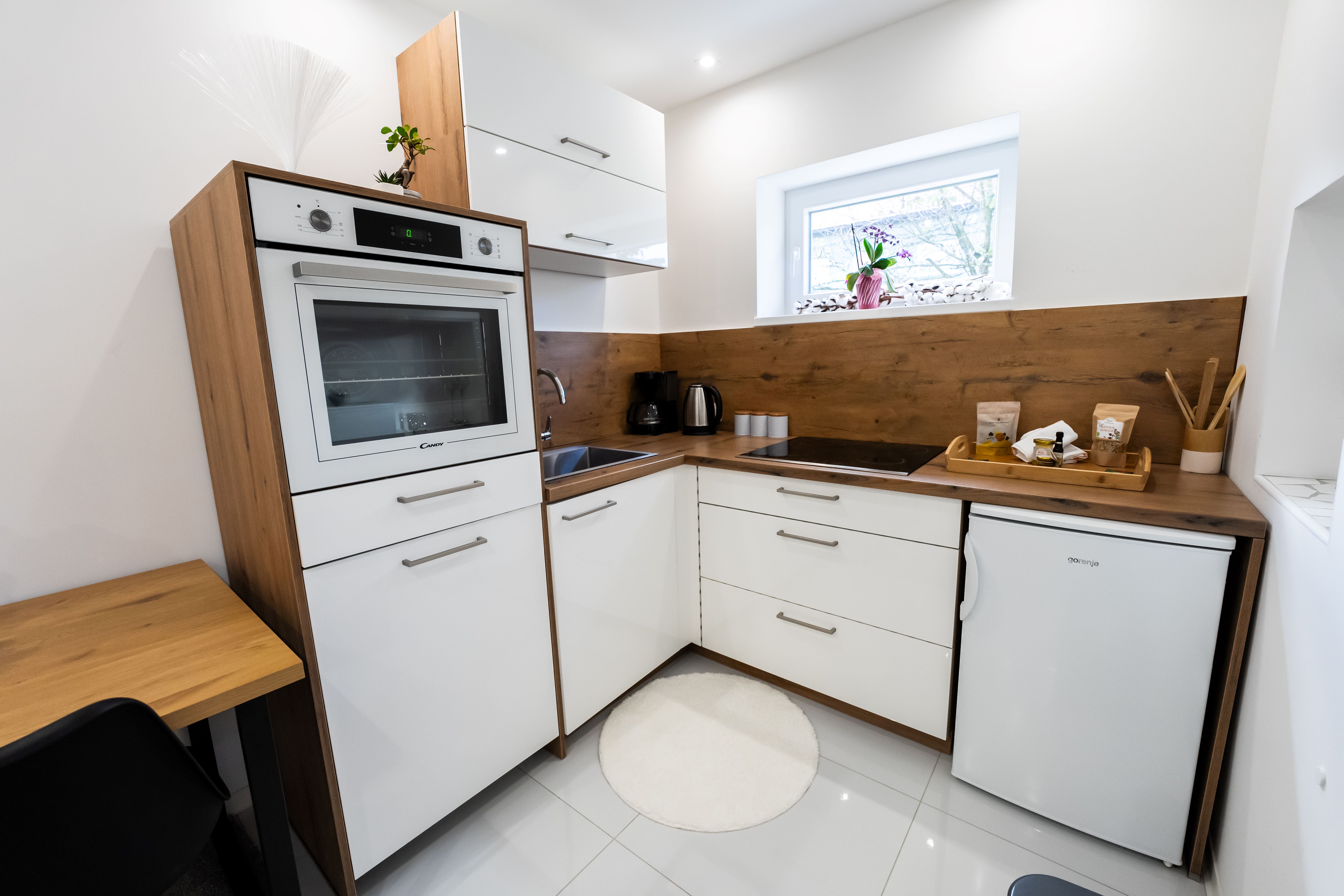 Kuhinjo s pečico, pomivalnim strojem, kuhalno ploščo, hladilnikom in z osnovno posodo za pripravo hrane